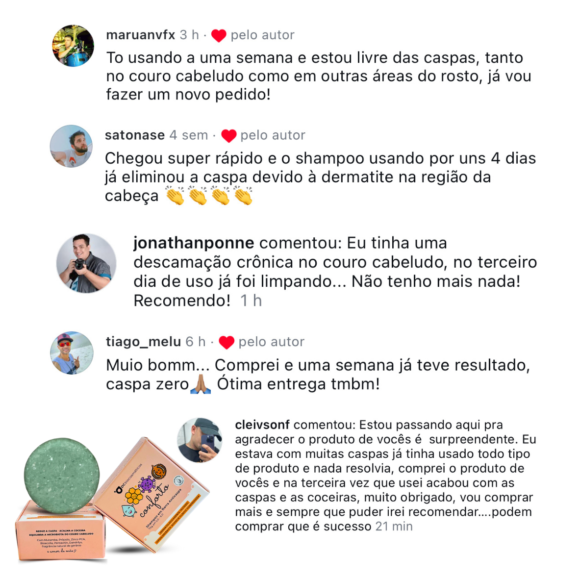 Resultados visíveis desde o 1º uso. Eficácia comprovada: 100% das pessoas que testaram notaram a redução da caspa e vermelhidão nos primeiros 30 dias de uso.*